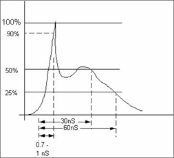 测试波形由一个以300ms间隔的15ms脉冲脉冲组成。脉冲的上升时间为5ns,停留时间为50ns,重复频率为5khz。